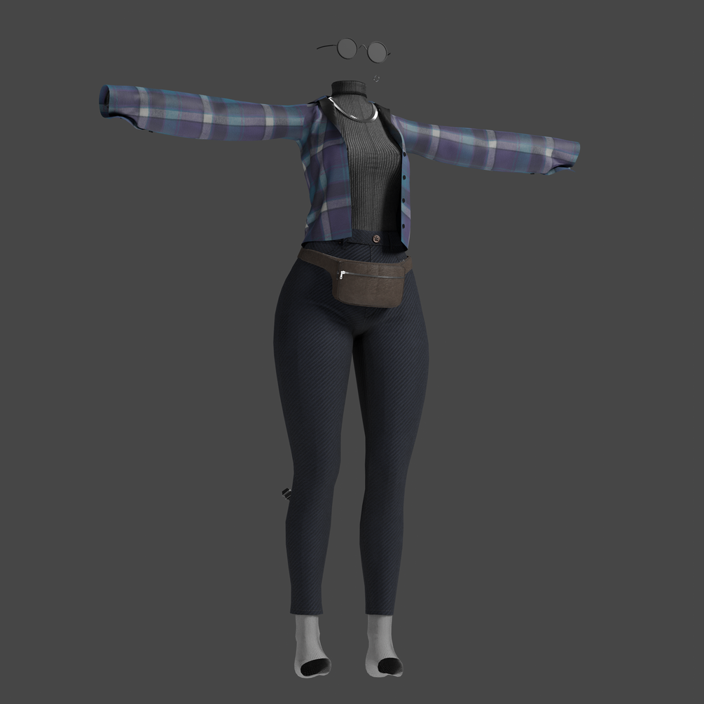 - Quad-based topology. Tris and n-gons are used where convenient, e.g. on the seams of the jeans.