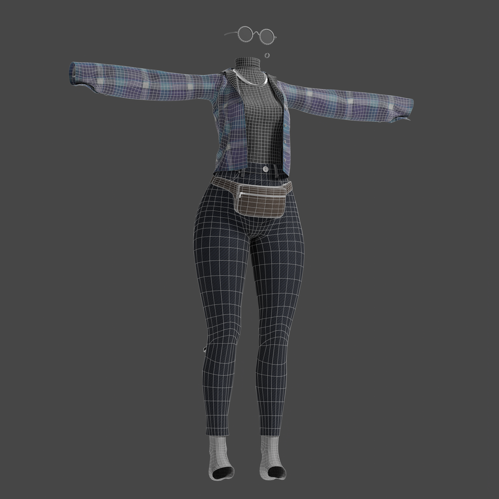 - Quad-based topology. Tris and n-gons are used where convenient, e.g. on the seams of the jeans.